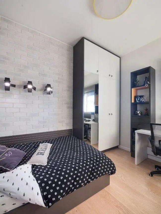 儿子的房间虽不朝海,但大窗户让视野和采光都不差。房间色调是男孩喜欢的黑白灰,墙上三盏灯是他自己选的,挂在床上方正合适,平时坐在床上看书学习,光线正好,也透着他的小个性。