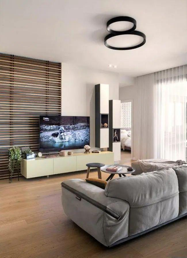 电视背景墙用木条做了装饰,避开了单调感,电视挂在墙上,下方的柜子能随手塞些杂物。