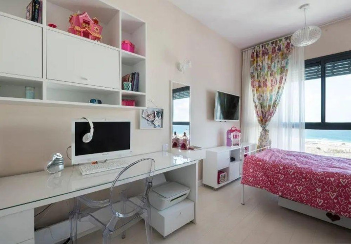 房主女儿的卧室也朝着海,窗帘是鲜亮的配色,跟床单、小城堡摆件搭得正好,满是活泼的少女感,双层窗帘拉起来时,又添了层梦幻。