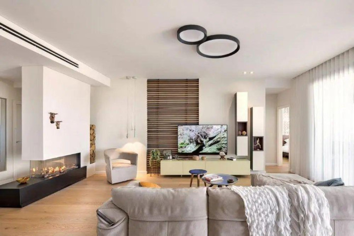 背景墙另一侧挂着两个长方形收纳柜,中间开放区摆上小摆件,添了不少生活气。客厅里还有个壁炉,冬天点起来,既暖了屋子,又添了份温馨的氛围感。