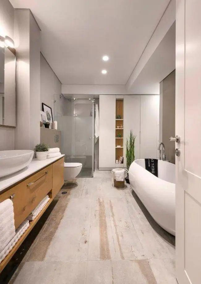 家里只有一个大卫生间,却设计得紧凑又实用。洗手台下面做成收纳柜,浴巾、洗漱用品都能塞进去。马桶后面搭了个台子,放卫生纸顺手,摆上小装饰品也挺好看。浴室做了干湿分离,浴缸单独放在一侧,泡澡时能安安稳稳的。