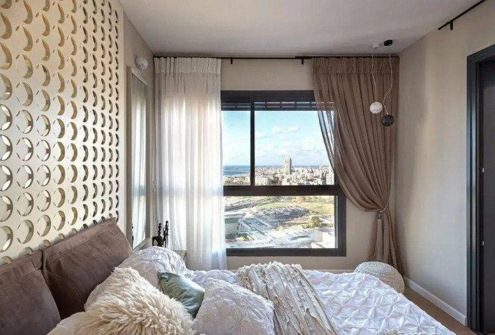 卧室窗帘选了薄纱的,一半白一半棕,跟床的风格呼应着,风一吹,纱帘轻晃,连阳光都变得柔和。
