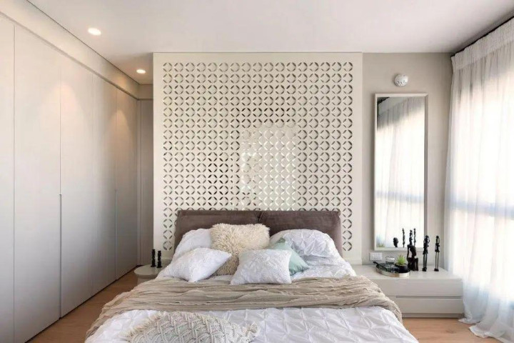 主卧的床头加了隔断,后面隔出个衣帽间,收纳不愁。床是清新的简约风,床头柜还能当梳妆镜用,一面朝海的大窗户让房间采光极好。